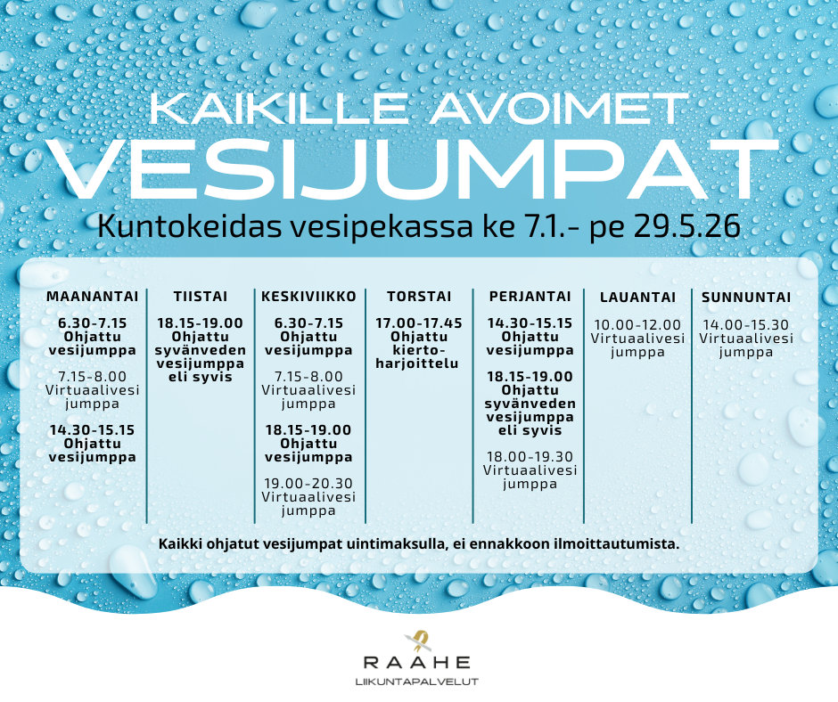 Kaikki jumpat uintimaksulla, ei ennakkoon ilmoittautumista.